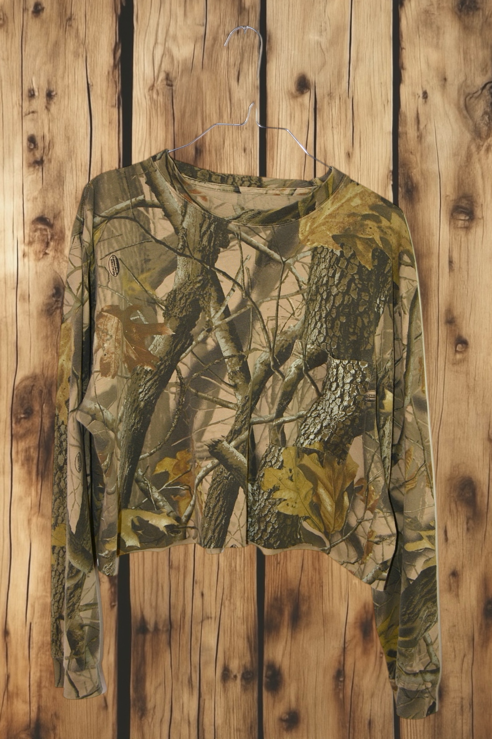 Real tree camo vintage long sleeve top that has been cropped. Beautifully worn in and thrashed in all the right places. Back has a small hole. (Hardly noticeable, see photo for reference).