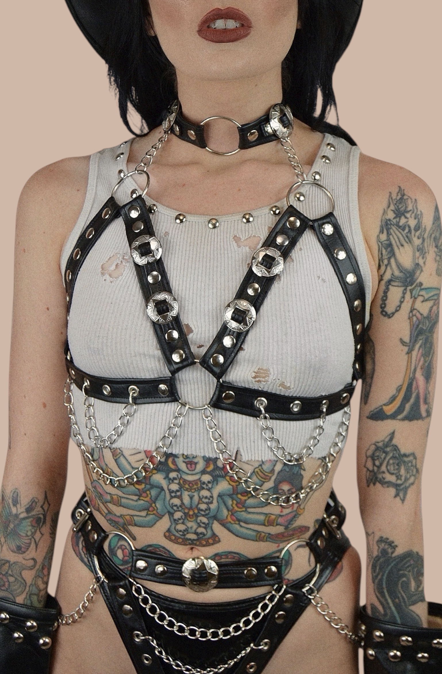 Our vegan leather choker and bust harness is fully attached and adjustable. Featuring all things BADASS including o-rings, conchos, chains, studs and buckles. This piece is very versatile. Wear it over a bikini top or over/under a band tee!