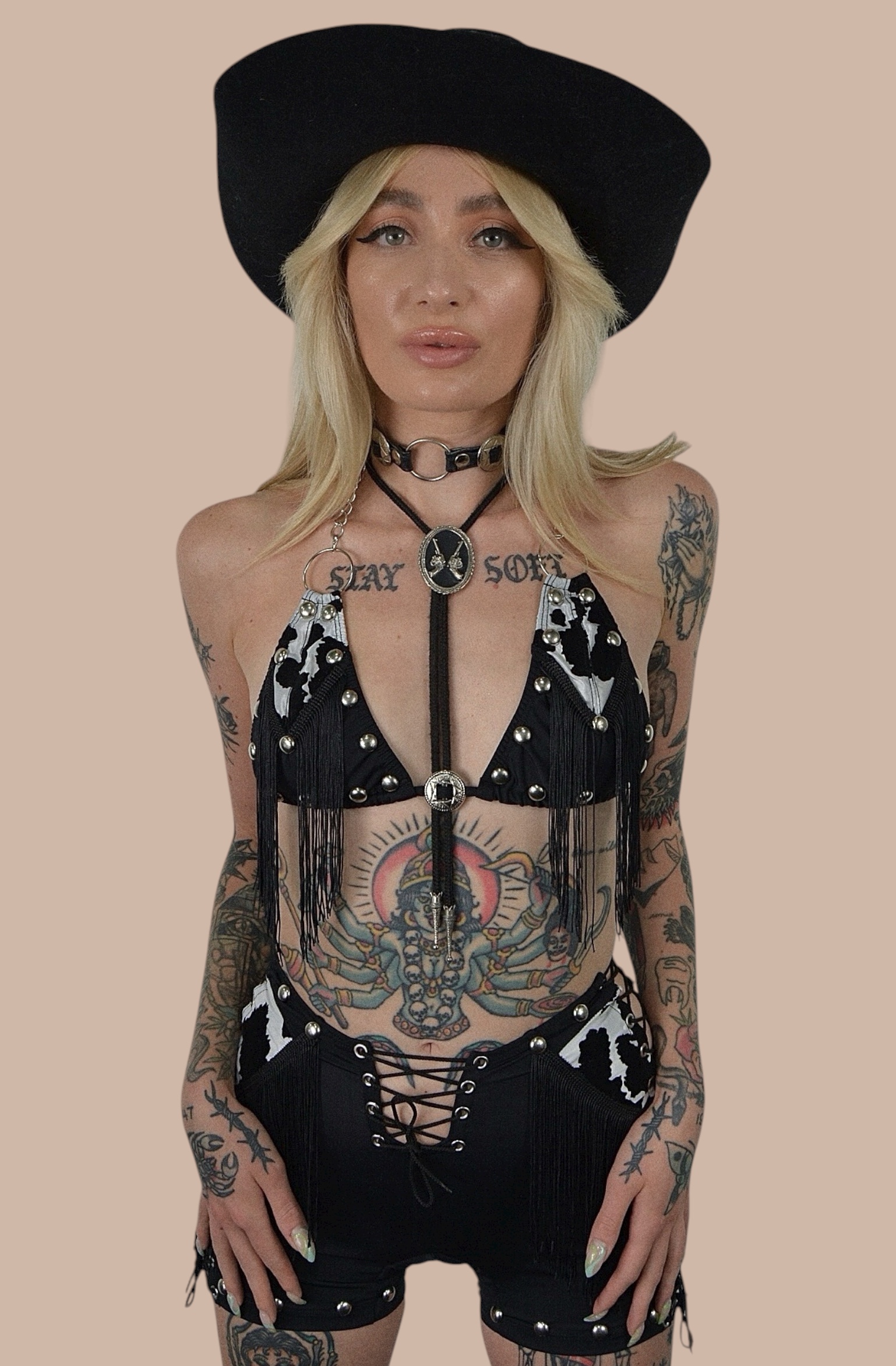 Yeehaw! Our cow print and black top features a centre front concho, fringe, dome studs, o-rings and an adjustable chain strap.
